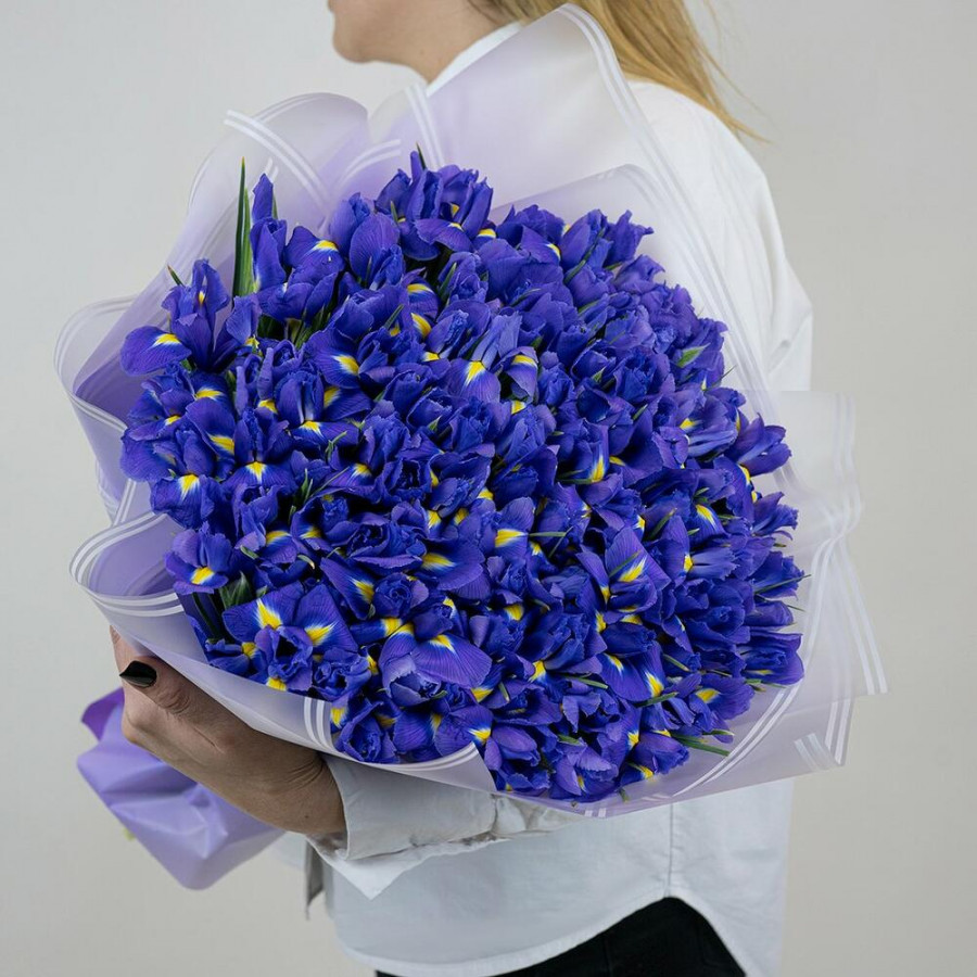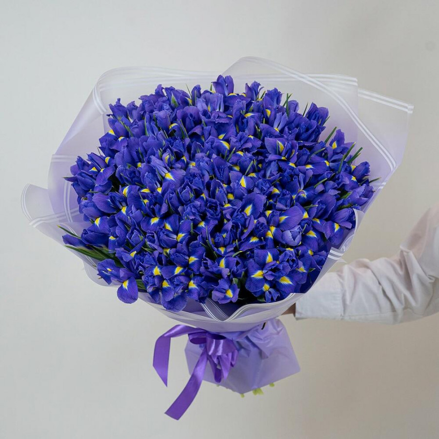 На фото букет из 101 синего ириса. В составе: ирис 101 шт, дизайнерская упаковка 1 шт, атласная лента 1 шт, . Все цветы свежие и ароматные, букет красиво оформлен и отлично подходит для подарка. Доступна доставка цветов или самовывоз.