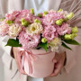 На фото композиция 11 розовых эустом в коробке. В составе: эустома (лизиантус) 11 шт, рускус 5 шт, оазис флористический 1 шт, шляпная коробка (m) 1 шт, атласная лента 1 шт, . Все цветы свежие и ароматные, букет красиво оформлен и отлично подходит для подарка. Доступна доставка цветов или самовывоз.