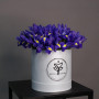 На фото 25 фиолетовых ирисов в коробке. В составе: ирис 25 шт, оазис флористический 1 шт, корзина (s) 1 шт, атласная лента 1 шт, . Все цветы свежие и ароматные, букет красиво оформлен и отлично подходит для подарка. Доступна доставка цветов или самовывоз.