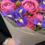 Букет из розовых пионовидных роз и синих ирисов в Новокузнецке